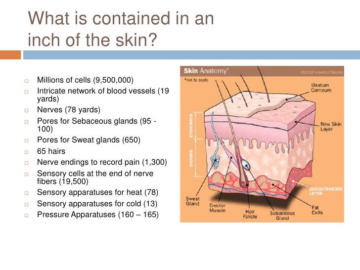 .Beginning with something relatively simple such as our skin, it would have to be paper thin in places and made to stretch evenly over some eighteen square feet of the body. As a sample of the whole, a piece of skin the size of a postage stamp would require 9.5 million cells, 78 yards of nerves, 650 sweat gland pores, 95-100 oil glands and 1300 five nerve ends to record pain. Plus that there are extremely complex sensors to detect heat, cold and pressure.
