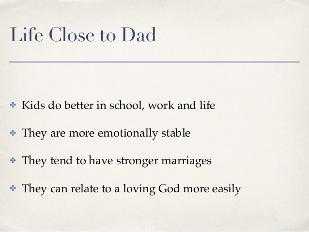 Kids who do have their dad at home do better at school, work and life. They are more emotionally stable. When they marry, they tend to have stronger marriages. And they can relate to a loving God more easily.