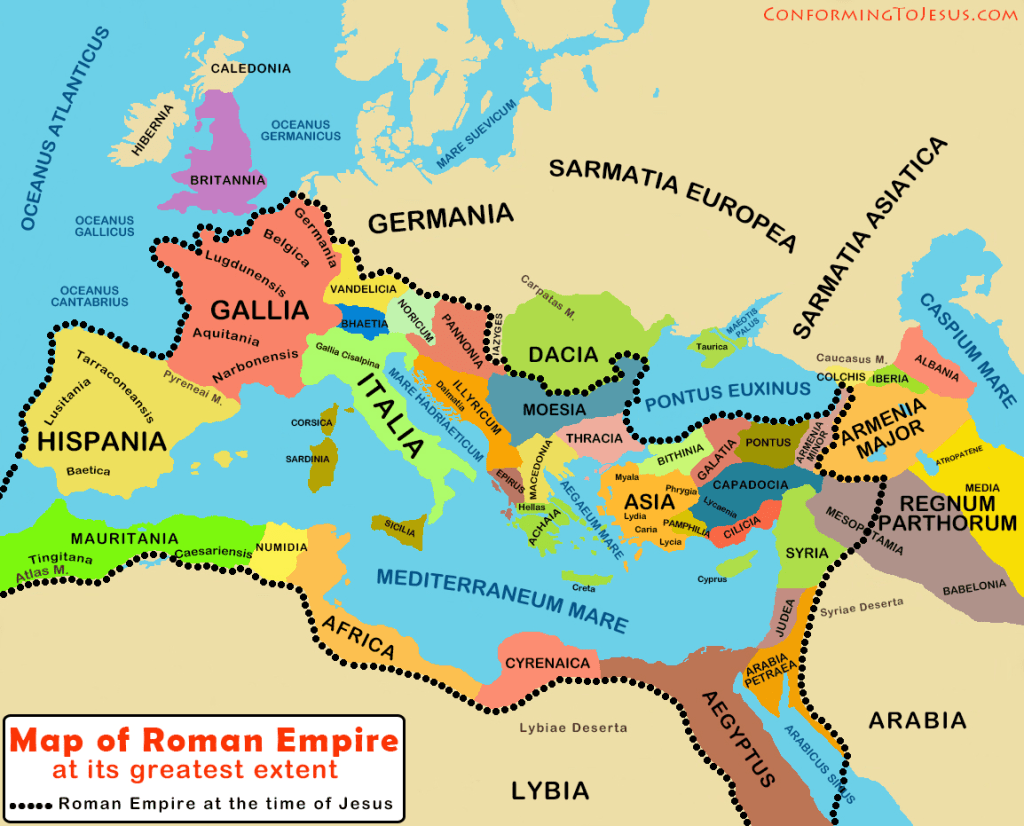 When Jesus was born in Israel it was occupied by the Roman Empire. The Military Commander and Roman Emperor was Octavian, better known as Caesar Augustus and the grand-nephew and adopted son of Julius Caesar who was assassinated. The Roman Senate honored him with the title Augustus, which means “reverend,” “the exalted,” or “the venerable,” in recognition of his efforts to restore order after the Roman civil war. The many provinces within the Roman Empire were governed with a heavy hand, yet with some local autonomy. In Israel, the Jews were allowed to maintain their religion and culture. Augustus died and was succeeded by Tiberius Caesar, a ruler whose own life was filled with conspiracies and power struggles. Although Tiberius Caesar was only mentioned once by name in the four Gospels, he was the emperor when Jesus ministered and preached on earth. He was also the emperor when Jesus was executed by means of a Roman crucifixion. Although not directly involved with the execution of Jesus, his governance set the stage for key figures like Pontius Pilate, who was responsible for Jesus’ trial and execution. At this point in time the Roman Empire was vast and powerful, stretching from Spain in the west to Syria in the east and encompassing parts of North Africa and Egypt.