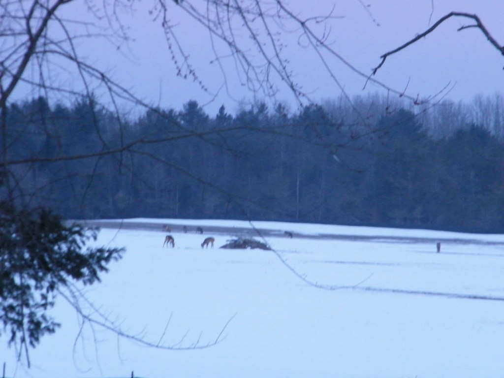 I made my way to the top of the hill where there was a corn field that had been harvested last fall. Being out in the open, the field was mostly bare and free of snow. the ground was full of deer tracks, where deer would come out of the snow filled forest to forage for corn kernels missed by the corn harvester. Much like the field right behind my house in Hillsdale. Except that field had been planted in soybeans.