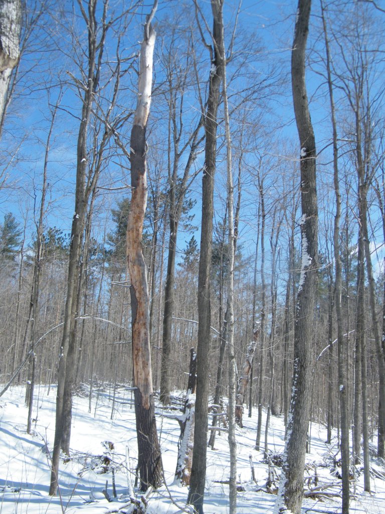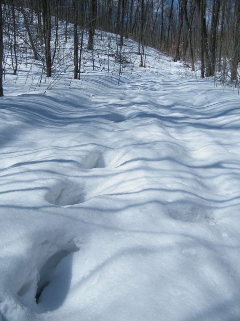 So I headed into the forest. Fortunately we had some fresh snow the night before. With all the freeze/thaws we’ve been having, the trails in the forests have become incredibly treacherous. For my safety I have not gone in the forest for a few weeks. I have missed the woods enormously. The fresh snow stuck to the ice, giving it fairly good traction. You just don’t want to step off the trail where the snow is not packed, as the snow is still quite deep in the forest. You can easily go up your knees in snow.