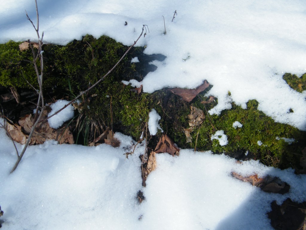 I worked my way to the back of the forest to a large standing dead tree, which stood on a south facing hill. Some other times I have seen from a distance a pileated on this particular tree. But not that day. As I moved my gaze from the standing dead tree to the ground, a vivid green caught my eye. It was a patch of moss and was my 1st hint of spring as the snow melts in the forest. Mosses are a plant known as bryophytes, which don’t have a vascular system with roots like trees do. The moss was so vivid green. Full of water from melting snow and a bright sun to photosynthesize, my heart was dancing. All I wanted to do was tenderly touch it.