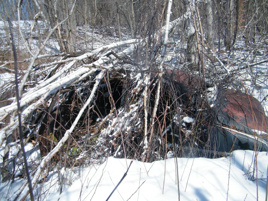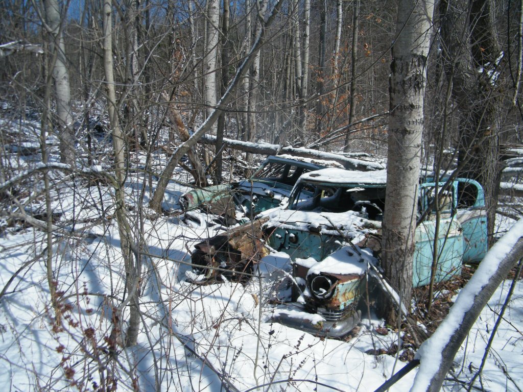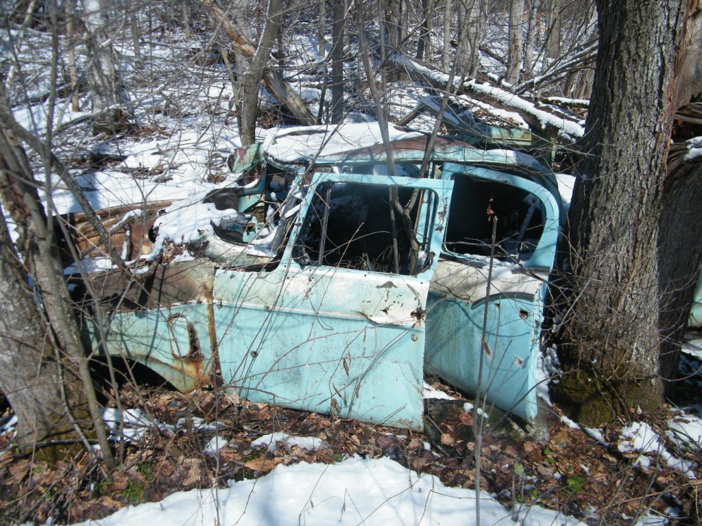 I walked along the edge of the field for several hundred meters. There was a something unique hidden that I was looking for. While walking I kept looking for it at the bottom of a steep ridge. Did I walk too far? Just then a glint of something shiny caught my eye for a fraction of second. A piece of chrome caught the sun. I had found what I was looking for. It was a small graveyard of three old cars that were probably dragged a couple hundred meters down the steep ridge over 50 years ago. It is now extremely overgrown. Once the leaves come out, this graveyard is pretty much impossible to find. In the summer I could be only 20 feet away and not see it. The ridge was very steep. This was only my fourth time I’ve been out there. But there were a lot more downed trees than what I remembered. I am guessing it was due to last years’ ice storm. Sinking in the snow past my knees, and climbing over a lot of deadfall, I had to be extremely careful. I had a camera, but my cell phone was at home. If something were to happen, and I couldn’t get back up that ridge, I would be adding myself to that graveyard.